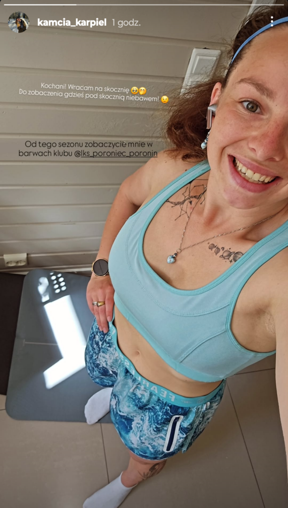 W poniedziałkowe popołudnie czterokrotna mistrzyni Polski zamieściła relację na swoim profilu na Instagramie, w której poinformowała o powrocie do treningów. – „Kochani! Wracam na skocznię. Od tego sezonu zobaczycie mnie w barwach LKS Poroniec Poronin” – poinformowała Karpiel.